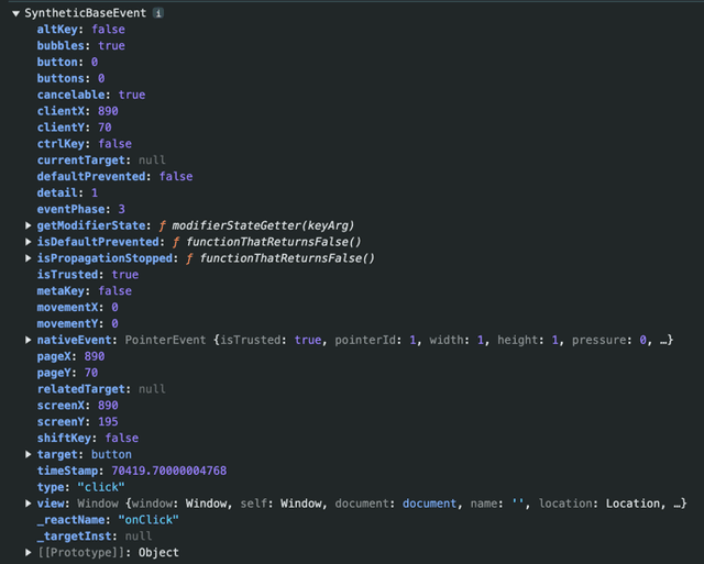 <button onClick={handleEvent}>click</button>;아래와 같이 로그를 보면 이벤트 객체가 SyntheticBaseEvent로 나오는 것을 확인할 수 있습니다.